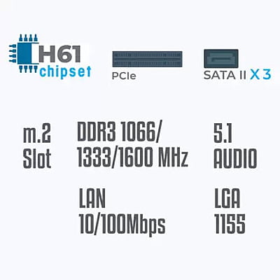 Processor support Supports Intel® i7/i5/i3/Pentium/Celeron processors in LGA1155 Chipset Intel® H61Chipset Memory support 2 DDR3 dual-channel slots, Support DDR3 1066/1333/1600MHz memory LAN Supports Realtek 8106E 10/100 Mbps Audio Realtek 662 3xAudio Jacks for 6 channel High definition audio Back panel 1 PS/2 mouse/keyboard port, 1 VGA port, 1HDMI port, 4 USB 2.0 ports, 1 LAN port, 3 audio jacks On-Board connectors 1 x Front panel connector, 1 x speaker connector, 1 x Front panel audio connector (2 x 5pin), 4 x USB 2.0 ports, 4 x SATA 3Gb/s (SATAII) ports, 1 x 4pin CPU fan connector, 1 x SYS fan connector, 1 x 24-pin ATX power connector, 1 x 4-pin ATX 12V power connector, 1 x 3pin clear CMOS header Slots 1 PCI Express x16 slot, 1 PCI Express x1 slot