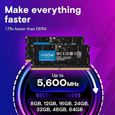 The Crucial 32โฏGB DDR5โ5600 SODIMM CL46 (model CT32G56C46S5) is a highโperformance laptop memory module. It runs at 5600โฏMT/s, has relatively loose timing (CL46โ45โ45), operates at low voltage (1.1โฏV), and uses the standard 262โpin SODIMM form factor. It's intended for DDR5โcompatible laptops / ultraโportable systems, enabling faster multitasking, smoother performance, and modern memory features with a reliable brand backing.
